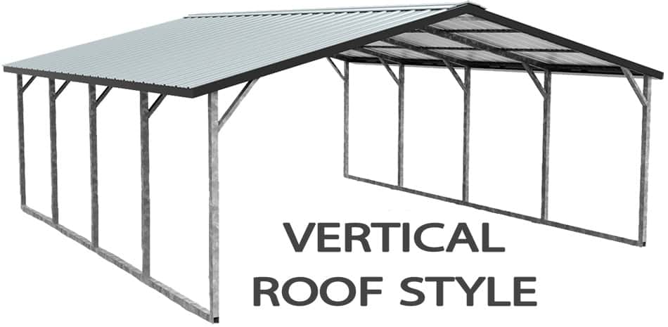 As displayed on our carport and garage sections of the website, the ridges of the steel panels in a horizontal roof run parallel to the sides and ridge of the carport or garage. Water, snow, etc., will drain to the front and back of the building, towards the door openings. If the building is perfectly level, water will tend to pond on a horizontally installed roof. On a vertical roof, the ridges of the steel panels run from the top of the carport or garage to the sides. This roof configuration displaces water, snow, etc., much more efficiently and water will not pond on the roof. Water will also drain away from the door openings (unless the doors are installed on the sides of the carports or garages).